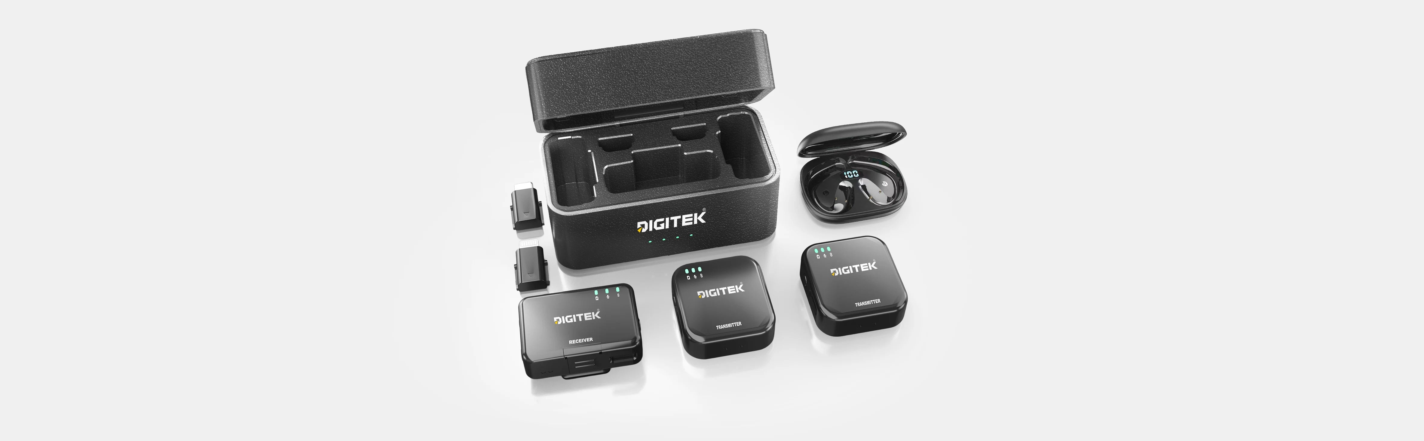 The Digitek DWM-106 Charging Case: Stylish and long-lasting, equipped with a 1000mAh battery to ensure your receiver and transmitters stay powered while on the move.
