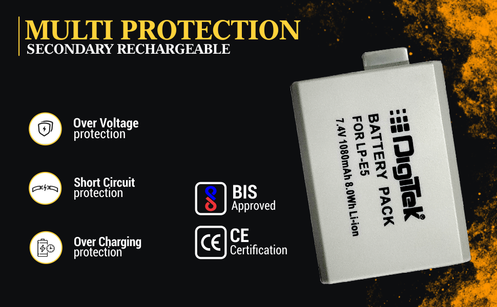 Special Features | Digitek Li-ion Battery LP-E5 is rechargeable & fits for Canon Model DSLR Camera.It is of 1080mAh & 7.4V capacity., Compatible Model Canon EOS Rebel Xsi, XS, T1i EF-S, EOS Kiss X2, Xsi, 500D, 450D, 1000D and Digital Rebel XS. |