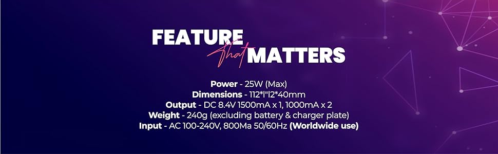- Dual battery charger: This super compact charger gives you the benefit to charge 2 batteries at the same time with two easily interchangeable battery plates.