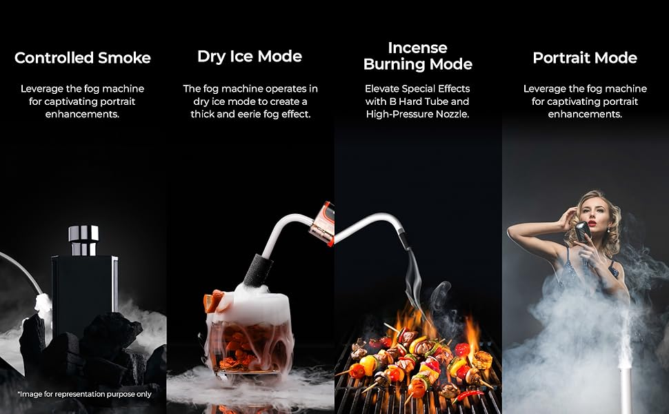 - Ideal for Film Producers, Photographers, and Short Video Creators on location shooting. With the unique accessories of Smoke Machine, you can create not only different Smoke Effects but also can create Magical Liquid Smoke Effects and replace the need for Dry Ice in Product or Food photography.