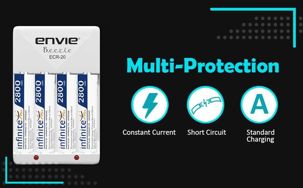 - LED indicator: Two LED indicators show the charging process of their corresponding slots but will not turn off once fully charged, Package Content: Envie Battery Charger ECR-20, 4 Pcs- AA 2800 Ni-MH rechargeable batteries. One must ensure the Polarity of the batteries while putting on the charger. Otherwise, the batteries will not get charged.