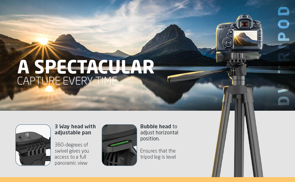 - Built-in bubble head to adjust horizontal position and 3-way head with adjustable pan to allow for tilt and swivel motion with portrait or landscape options