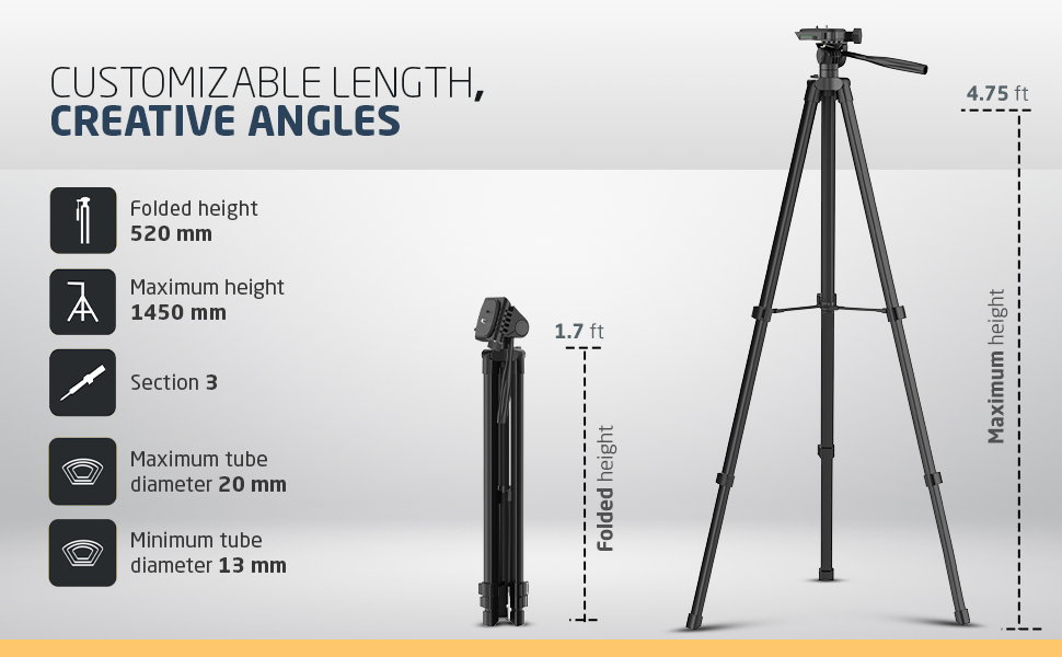 - Premium finish light weight professional tripod with adjustable height, multi level locking and steady rubberized legs