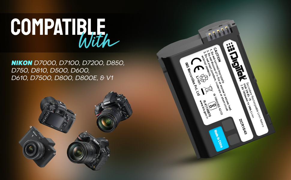 Special Features | Digitek Li-ion Battery EN-EL-15 is rechargeable & fits for Nikon Model DSLR Camera.It is of 1900mAh & 7.0V capacity. |